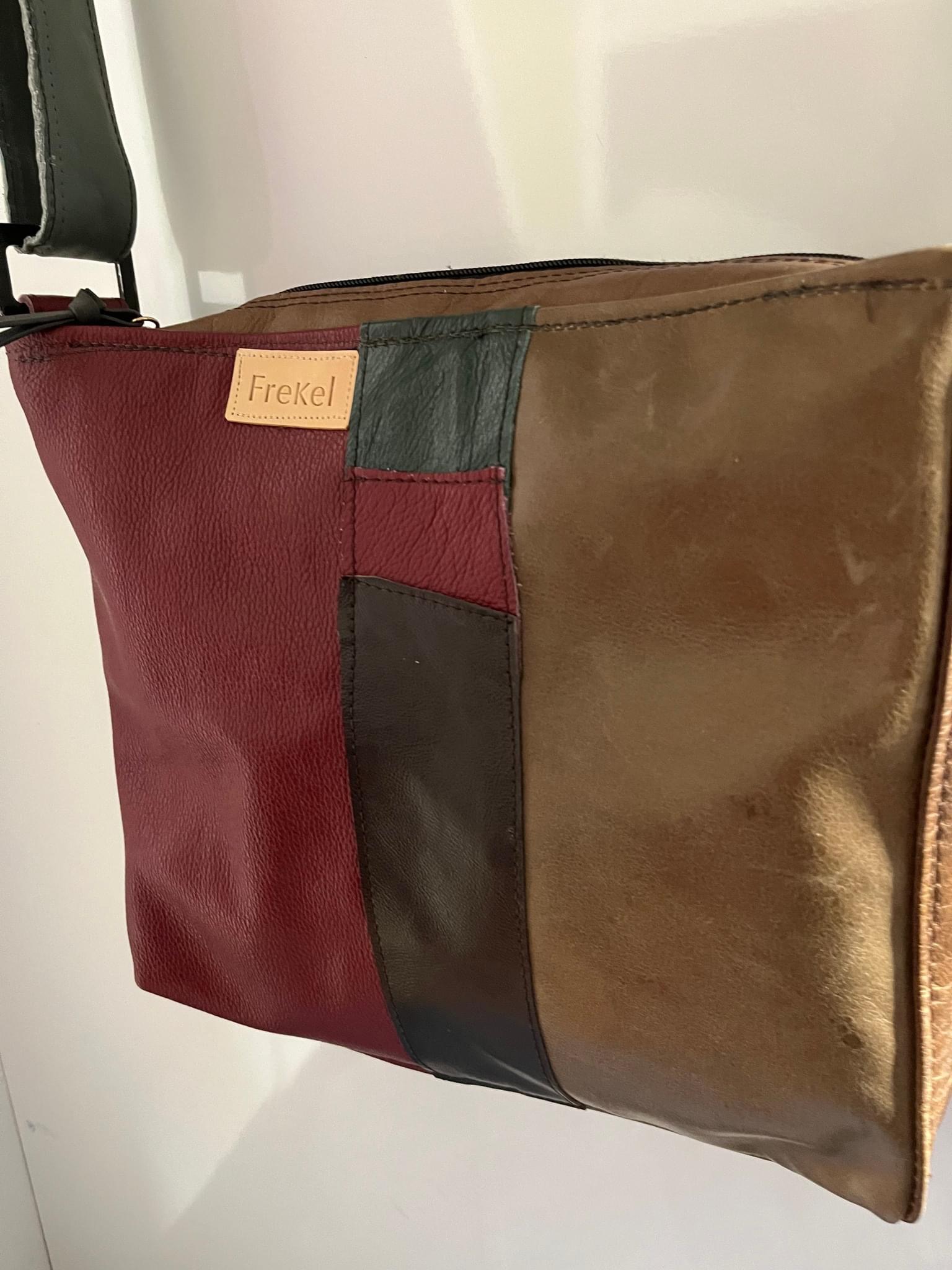 Patchwork Vintage Leather with Old Ancient Sutherland Tartan on front with a corsage of Leather and London Plane wooden button, zip closing, adjustable leather strap, lined in muted shades of blue with two pockets (one zipped) spacious bag.