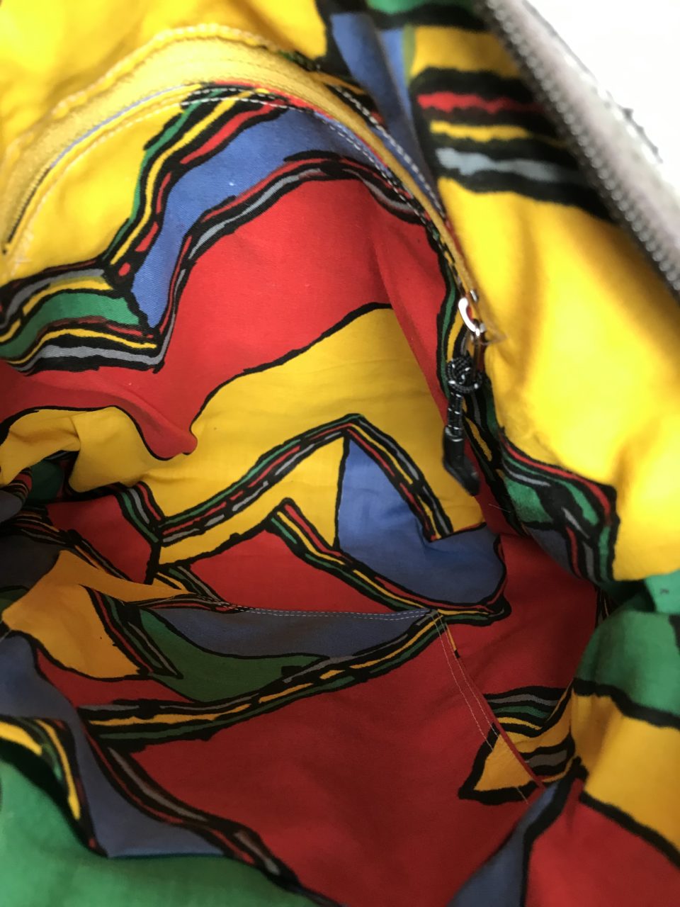Generous sized bag made from a Denim mini skirt, lots of pockets, adjustable strap. Closes with a zip and is lined in a blue/grey zigzag material complete with two pockets (1 zipped)